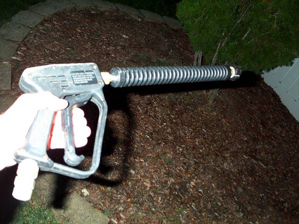 Big gun with trigger for a pressure washer. 280 bar, 4,000 PSI 150 C300 F. Gun measures aprox 22" length x 8" deep. Looks good though untested. Sold as is. Pick up from Villa Park. Please call or text show contact info