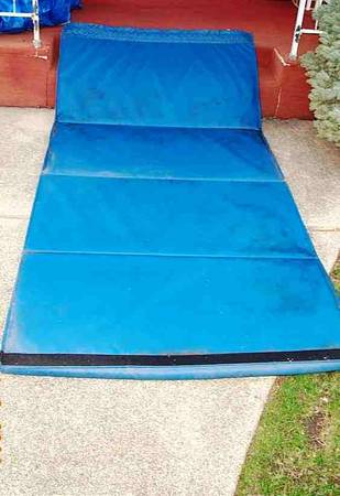 Portable folding blue light weight industrial quality gym mat. Great for wrestling training, cheerleading stunt training, safe tumbling practice, general exercise, sit ups, push ups, etc. Also good for a portable bed you can carry around for camping, sleeping in a vehicle or camper, etc. Also perfect for a senior dog. Easy clean wipe vinyl to assure sterile. Folds up for easy storage and transport. Measures aprox 48" wide x 96 1/2" deep x 1 1/4" thick. Pick up from Villa Park. Please call or text show contact info