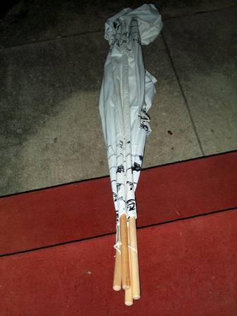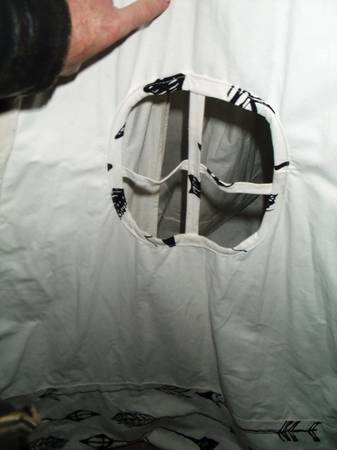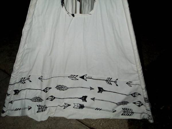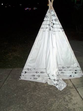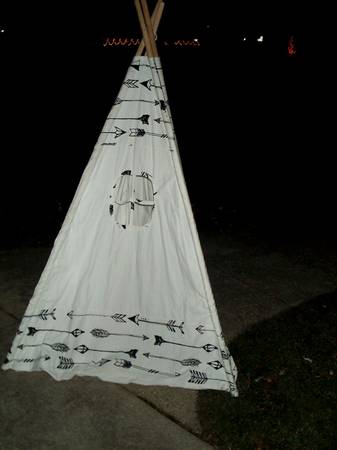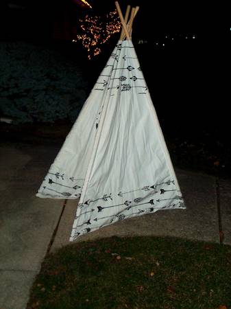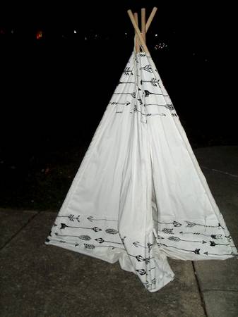 Compact size unique teepee tent. Thick canvas has arrow drawings on it. Wood pole supports open up. One part may be missing. Folds easily for transport and storage. This item would make for a great Indian prop or decoration. Measures aprox 38" wide x 38" deep x 62" height. Pick up from Villa Park. Please call or text show contact info