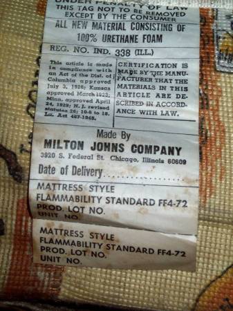 RARE unique collectable 1970's vintage twin size easy clean fabric patriotic mattress. Manufactured by the Chicago based Milton Johns Company. Presumed manufacture date circa 1974 to 1975 to be sold in lieu of the 1976 bicentennial celebration. No box spring is needed as as mattress employs integral support. Mattress features images of the Liberty Bell, Betsy Ross, Thomas Payne's Common Sense, Naval Canon and Congress Declaration. If you collect patriotic items this may be for you. Limited information available about this product. Another one of these may never appear again. Limited production. Overall good condition. Bottom material has some tearing. Top and sides are excellent. Measures 39" wide x 75" tall x 5 1/2" thick. Pick up from North Aurora, IL. Please CALL or TEXT show contact info