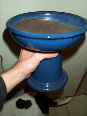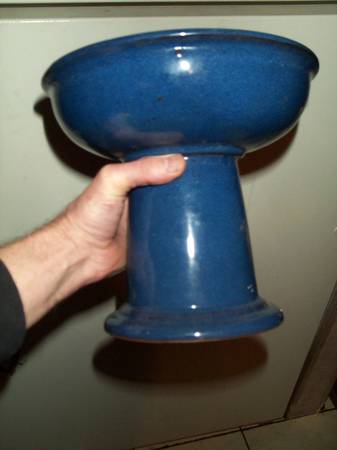 Heavy ceramic blue glazed round plant pot holder stand. Beautiful indoor, outdoor or porch self standing decoration. Measures aprox 9" round x 8 1/4" height. Pick up from Villa Park. Please call or text show contact info