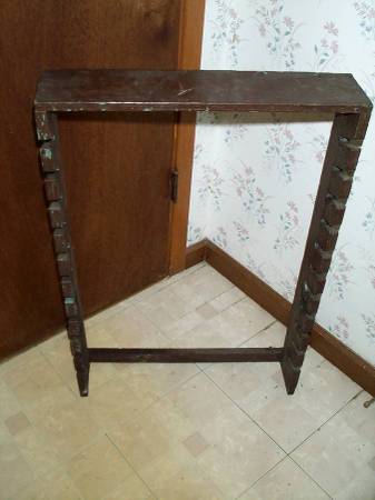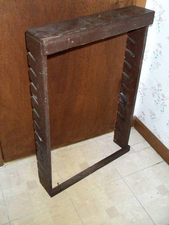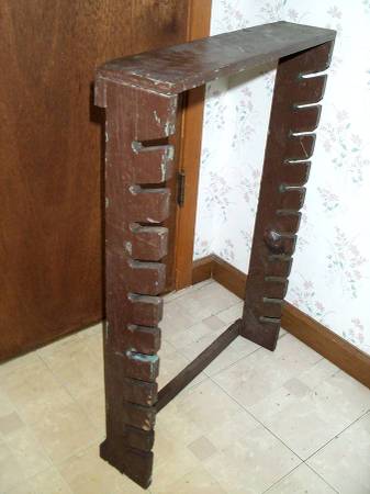 Antique custom made rustic looking pole holder wall mount or self standing organizer. Could have been for pool table cue sticks? This came out of a print shop. 11 slotted areas for poles. Each slot is 1/2" wide...so if you are using this for cue sticks make sure they will fit. Also great for garage where you may be organizing tools or parts. Unit measures aprox 21 1/2" wide x 5" deep x 32 1/2" height. Pick up from Villa Park, IL. Please call or text show contact info