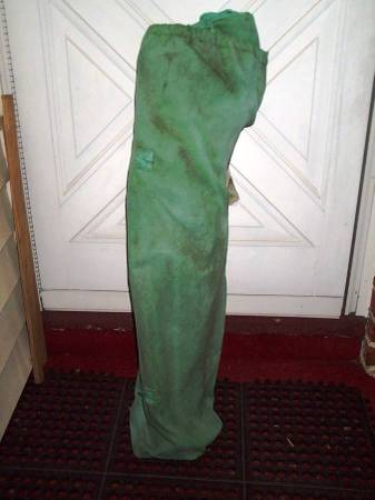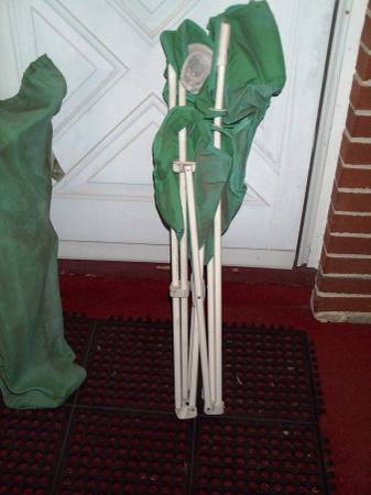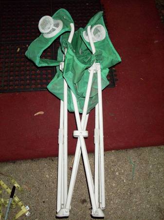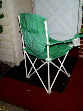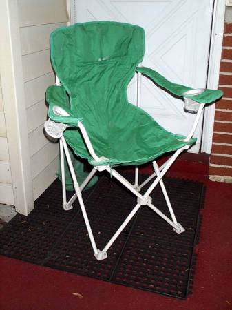 Portable chair in a bag. Green color. Deluxe arm rests with a drink holder on each side. Tubular metal supports. Folds and stores in an included bag for ease of transport. Great for events, camping and those who are on the go and want a comfortable place to sit. Chair measures 30" wide with arm rests x 19" deep x 36" height. From floor to seat measures 18" height. Bag has some storage wear. Chair is nice. Easy pick up a few blocks north of Roosevelt Road. Please call or text show contact info