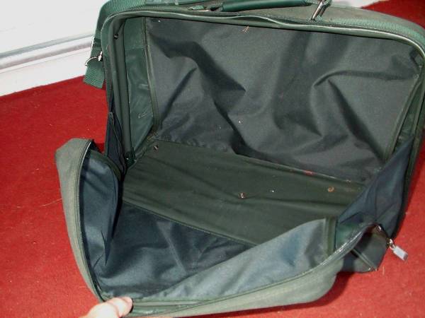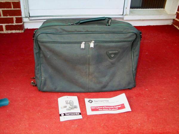 Excellent Samsonite Forest Green soft suitcase. Multi zipper compartment. Vintage 1993 though looks new-ish. Just some shelf wear. Still has the protective cover over the handle. "Trio GLS Framed Carry On" model 369340033. Original owner's manual inside. Suitcase measures aprox 21 1/2" length x 5" deep x 15" height. Pick up from Villa Park. Please call or text show contact info