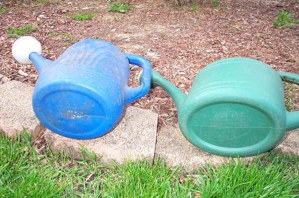 PRICE GETS BOTH. Two vintage garden water sprinkling plastic cans for hydrating your plants. One blue and one green. Will not separate. Pick up from Villa Park. Please call or text show contact info