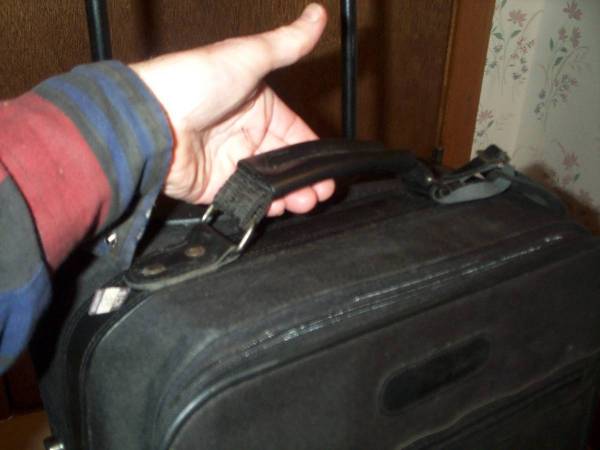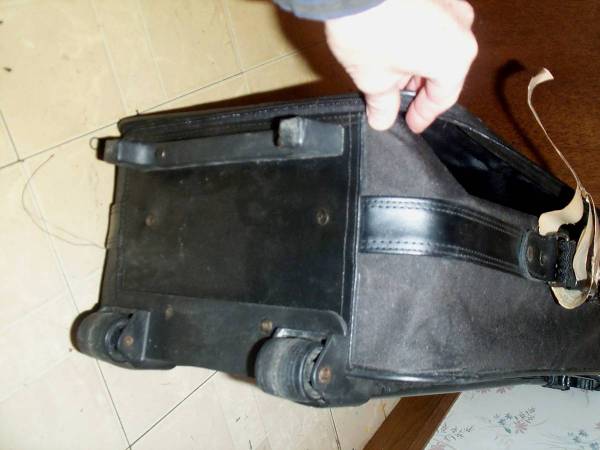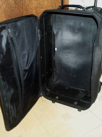 Compact Tour master black suitcase on wheels. Features a pull up retractable handle for ease of pull and rolling. Various zippered areas for organized storage. Measures aprox 14" length x 8 1/2" deep x 24" height. 32 1/2" height with handle extended. Pick up from Villa Park. Please call or text show contact info
