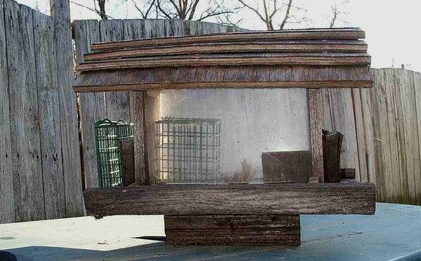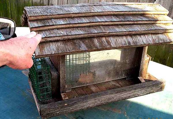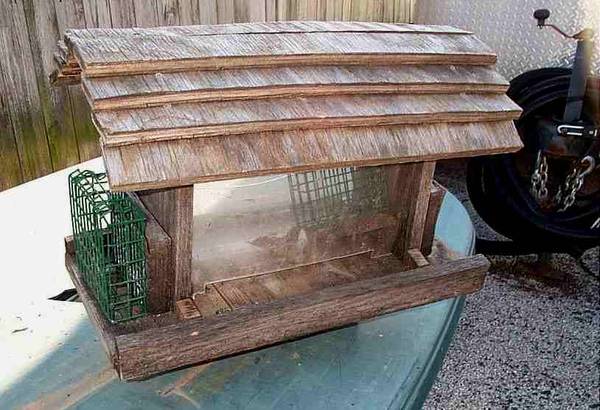 Rustic big wood bird feeder shaped like a home. Incudes two metal suet cages for wild bird seed. Fold back top to add seed. Feeder is designed to sit on a pole or it can simply be placed on a table. Measures aprox 20" length x 12" deep x 16" height. Pick up from Villa Park. Please call or text show contact info