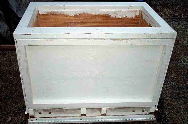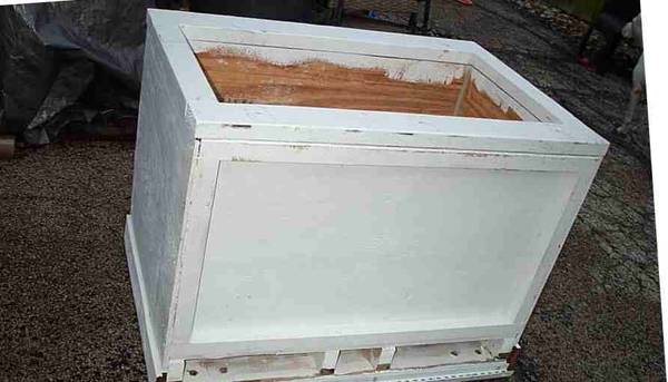 This is a custom manufactured LARGE HEAVY protective security box crate cabinet. Thick walls to protect fragile items. Looks like crate had wheels on the bottom at one time. Use this crate in the garage for tools, machine or to store items. Add wheels and move from place to place easily. Add a top to lock what is inside. Painted white. Measures aprox 41 1/4" length x 27 3/4" deep x 30 1/4" height. Pick up from Villa Park. Please call or text show contact info