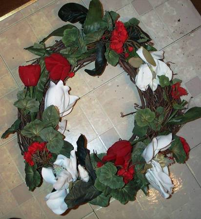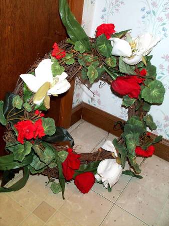 Beautiful stick wreath with red and white flowers. Great for spring or Christmas. Measures aprox 19" round x 4" deep. Pick up from Villa Park, IL. Please call or text show contact info