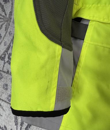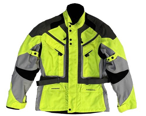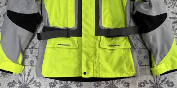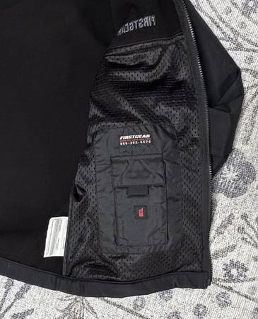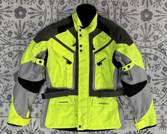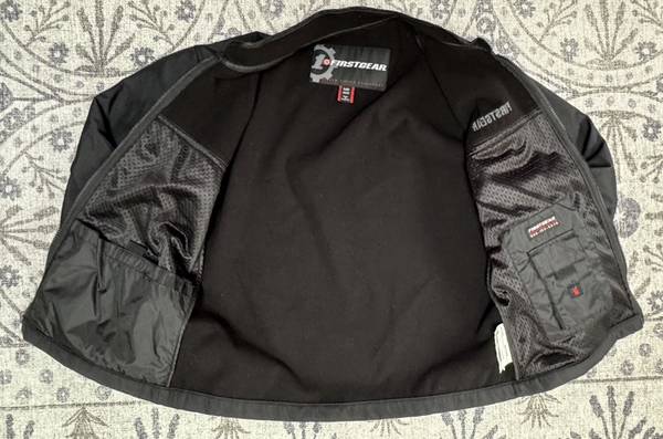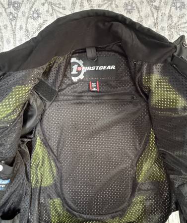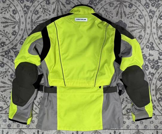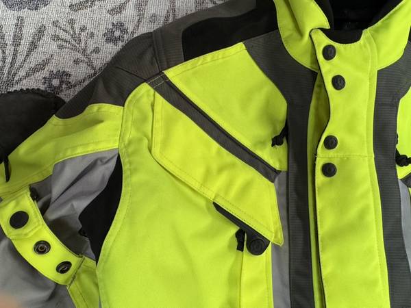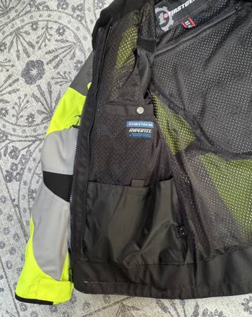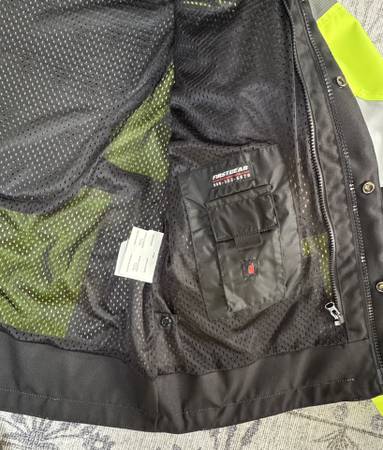 Firstgear Kilimanjaro 2-piece waterproof motorcycle jacket is in excellent condition, clean and never worn. Removable back, shoulder, and elbow armor, pockets galore, 3/4 length, chest, pit, and back vents, arm tension straps, adjustable cuffs and waist (velcro), 2-way zip closure, embroidered logos. Black thermal destination layer is fleece lined and has 2 fleece lined hand warmer pockets, 2 inside pockets, zip closure, stand up collar, and embroidered logo. There are a few minor scuffs from storage, see last photo.