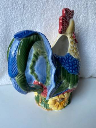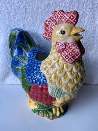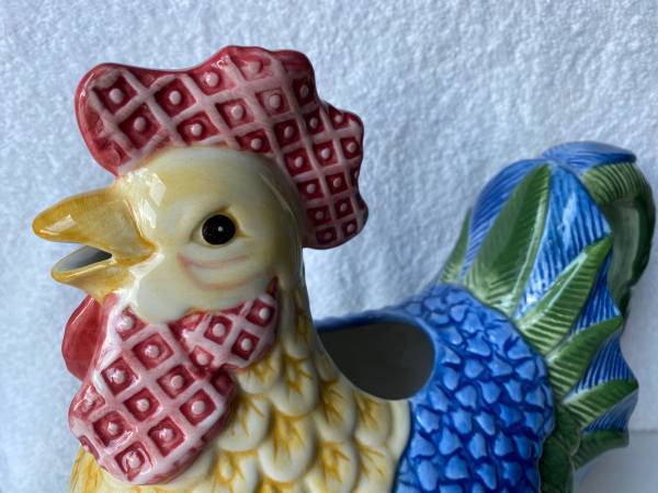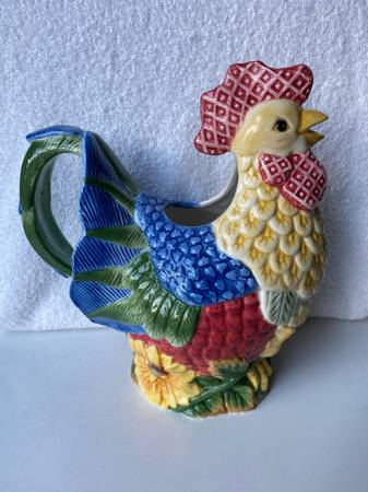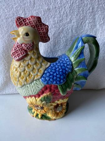 This is a rare figural rooster, hen or chicken shaped pitcher by Fitz and Floyd Essentials in the "Just Us Chicks" line