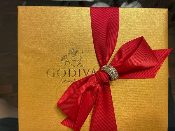 New, boxed, cellophane wrapped from Belgium, and ready for you to eat all 19 delicate, buttery chocolates in one sitting. When finished, wear the cubic zirconia scarf ring. If it doesn't fit a finger, put it on a bling-bling Mr. T starter kit necklace and wear it around your neck. Or put a scarf through it and look like a gazillionaire. The gold ring even says "Godiva" on the bottom of it! Great for a Godiva lover!