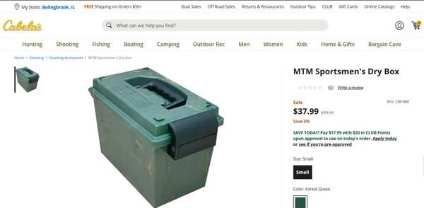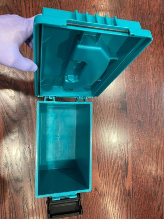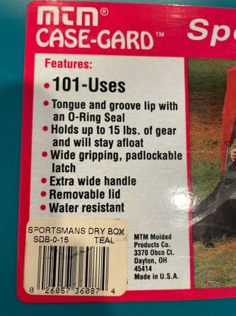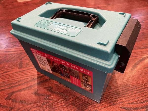 MTM Sportsmen's Dry Box. New, never used, and was stored since its manufactured date of 11/29/2021. Made in USA. Handsome teal color. Seals air and water-tight with rubber gasket. Exterior measurements are 14.5 L x 9 H x 7.5 W. Was $37.99 plus sales tax, totaling $41.31 at Cabela's. Why pay full price?