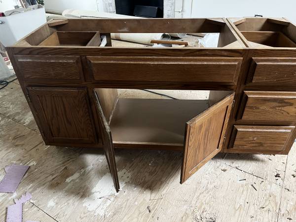 Oak bathroom vanity, 60 “ or 45, bathroom cabinet is made up of a 45” and 15 in cabinet, can be separated.