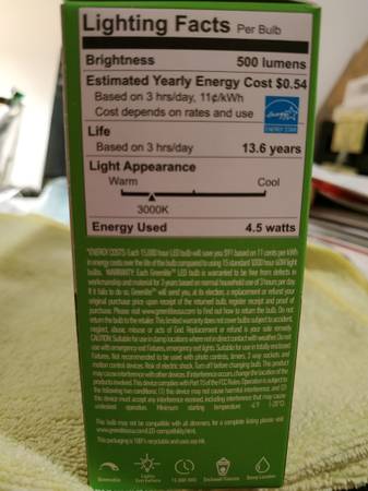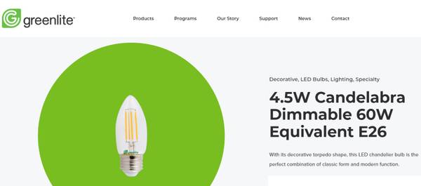 Dimmable. Beautiful candelabra bulb with LED "filament." Very bright at 500 lumens each, to brighten your home or other space! I overbought twenty 4-packs of these and then changed light fixtures. Let my loss be your gain. Further quantity discounts available if you buy more. Specs from https://www.greenliteusa.com/products/4-5w-candelabra-dimmable-60w-equivalent-e26/ and https://www.greenliteusa.com/wp-content/uploads/Candelabra-Spec-Sheet-2.pdf: