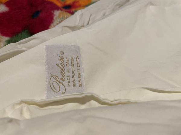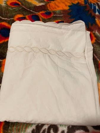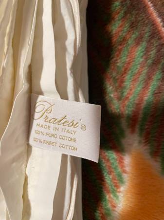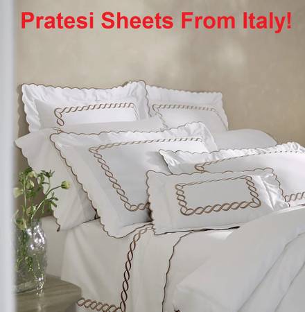 Hand-stitched from Eqyptian cotton percale in Italy by the Pratesi artisans. Classic embroidered scallop design oozes Pratesi and is its most popular embroidery, called the "braid motif." Double-faced embroidery. Base fabric is called "Splendore Sateen." Scalloped hem is completed with mezzo punto hemstitch. This is the sheet that is used in all top Chicago hotels--Four Seasons, Peninsula, and the Ritz-Carlton, as well as worldwide in similar, expensive five-star hotels. Put it on your bed and feel the luxury! Other than the emptiness of your wallet after your purchase from Pratesi on high-rent Oak Street in Chicago's Gold Coast, there is something unusually wonderful about falling asleep in bedsheets that cost $5,969.49 that just cannot be replicated by a set of sheets from Target that cost 1% of that price. Why pay full price and have to valet park your car for $55.00 for one hour on Oak Street? Buy from me and save big! And, I do not charge for valet parking in my driveway . . . yet.