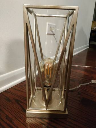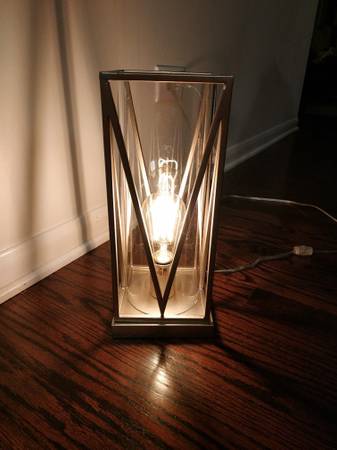 Understated elegance with a touch of boldness! This gorgeous industrial-looking table lamp is designed to evoke images of a glass hurricane lamp of yesteryear with circular tall glass covering the LED lightbulb, but reimagined in today's bold design. Its industrial steel has a base that meets delicate and precise, minimalist lines. Was $199.99 at a designer store. Seldom used. Needs a warm home that is more receptive to it than I was, as I have no space for it after downsizing soon after I bought it. I did not even yet remove the stickers from the socket base! My loss is your gain! Hurry before someone else gets it!