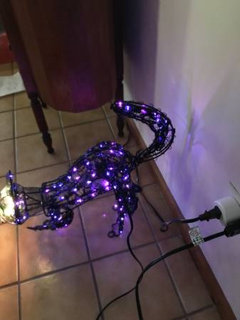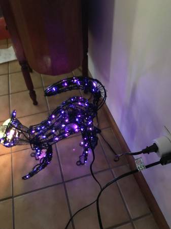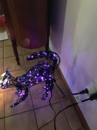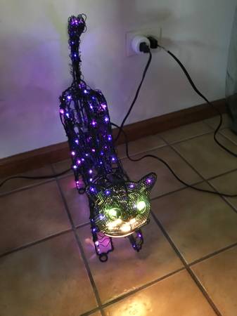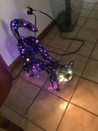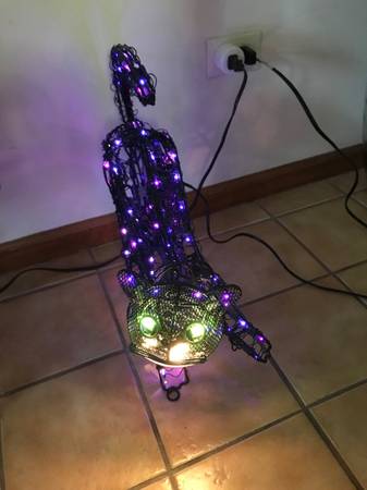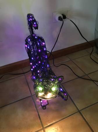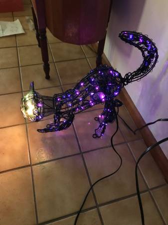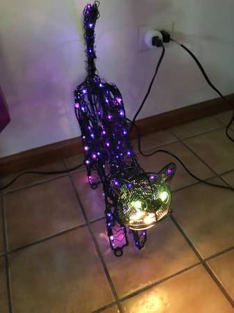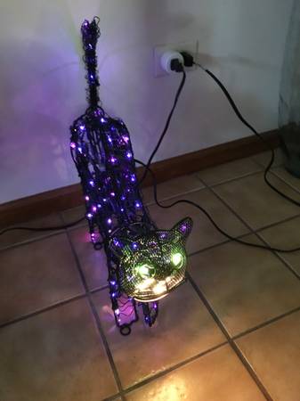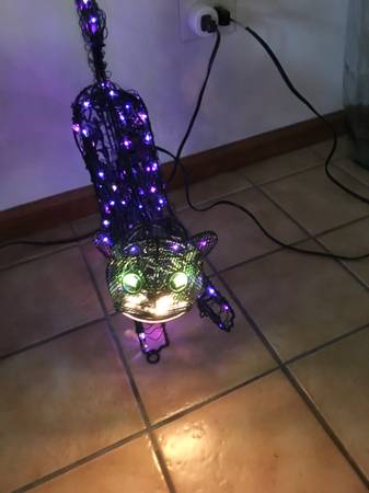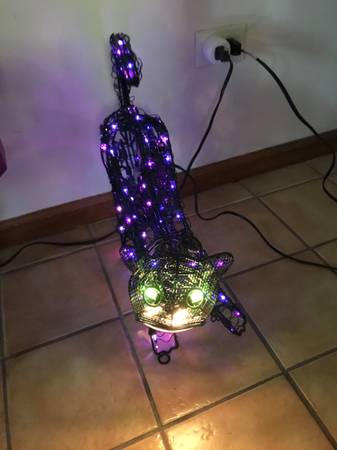 13 inch animated lighted metal black cat. One paw swipes, the head moves back-and-forth, and the tail goes up and down. I have taken multiple photographs to hopefully capture the different positions. The cat was only used a few times, never outside, and has always been a kid free home. It comes with stakes so that you can put it on the ground. There is one similar to this on eBay for auction with a starting bid of $110. That one does not have a swiping paw. Cash only. Price firm.