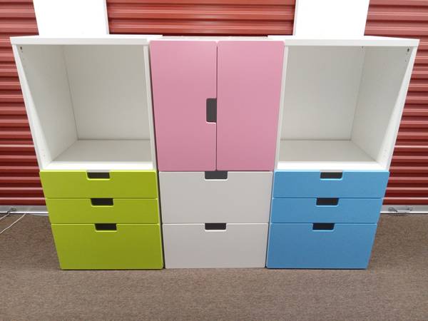 UPDATE. MORE PIECES WE ARE SELLING AND WILL BE ADDED SOON. For sale are three pieces of Ikea Stuva storage items that were purchased but will not be needed. Stuva is no longer sold but basically has been replaced with Smastad. All three items are still in their original boxes. The first is a white Stuva wardrobe frame. It measures approximately 23 1/2" wide by 19 1/2" deep by 75 1/2" high. It normally sold new between $95.00 and $100.00 with tax, and we are selling it for $70.00. We also have two white Stuva storage boxes with pink color doors. Each measure approximately 35 /12" wide by 19 1/2" high by 19 1/2" deep. The door opens to provide storage and each have casters to roll on. This color is no longer sold but a white version currently sells between $75.00 and $80.00 each with tax, and we are selling each for $50.00. Buy all three pieces for $150.00 and save about 100.00 or almost 1/2 price off... Would be willing to assemble items at no extra cost if you are seriously interested. Update: We also have more Ikea Stuva items (two 75" high pink doors for cabinet no longer in boxes but not used, two 50" high red doors still in their boxes, three used stuva benches, and three used storage boxes) that we will be listing in near future. We also will be selling two other units similar to the last picture but have 6 drawers each but not fully assembled due to unsure of what configuration we wanted. More info can be provided upon request.