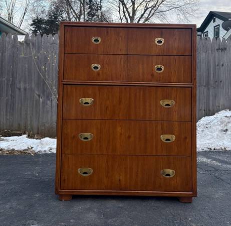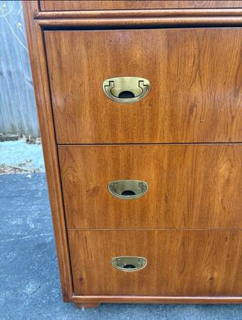 Available Drexel Passage Collection Campaign Chest of Drawers. This piece is in excellent condition very minimal amount of imperfections from age. All drawers work well, they consist of solid wood and they have dovetailed joints. Please see all pictures and ask any questions you may have about this piece. Delivery is available to all Chicago land and suburbs.