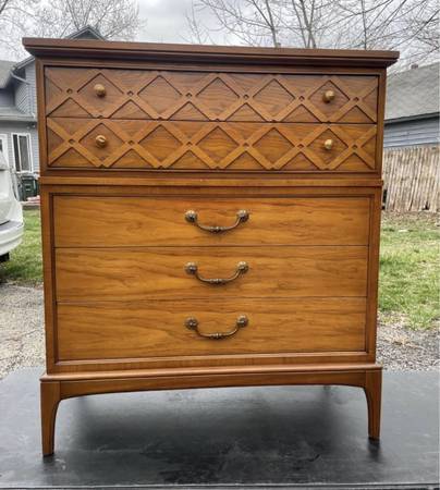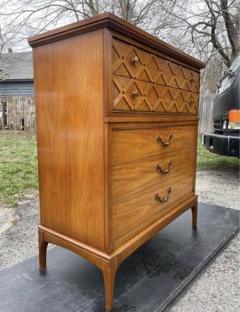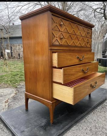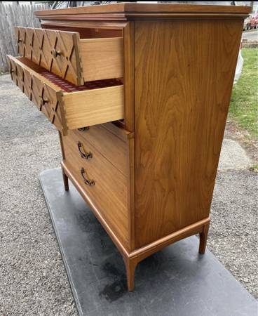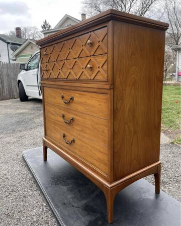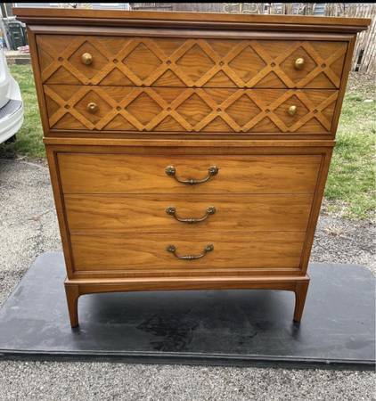Available Mid Century Modern 5 Drawer Chest by United. This piece is in excellent condition please see all pictures and ask any questions you may have about this piece. Delivery is available to all Chicago land and suburbs.Matching long dresser also available for sale , .message with any questions at show contact info