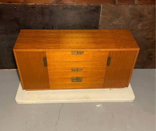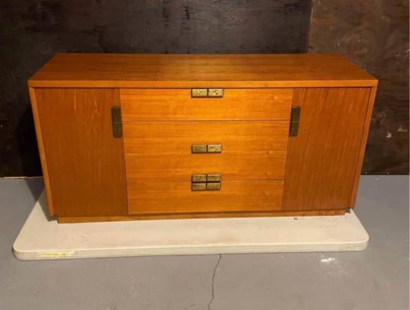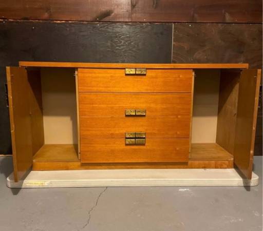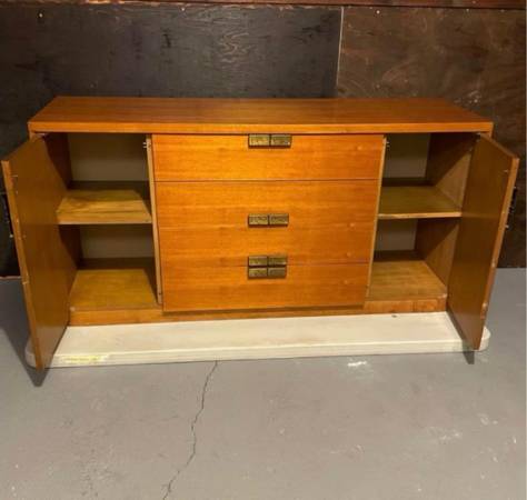 Available Mid Century Modern 4 Drawer 2 Door Buffet/Credenza/Media Center. This piece is in excellent condition all drawers work well and on this particular piece the inside of the drawers are made of metal. Each side has a removable shelf please see all pictures and ask any questions you may have about this piece. Delivery is available to all Chicago land and suburbs.message at show contact info