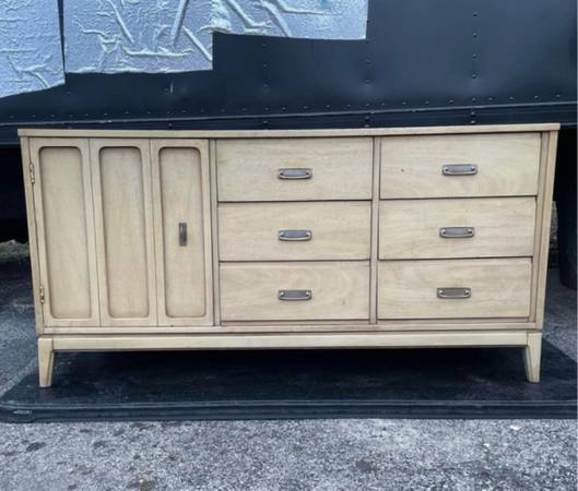 Available Mid Century Modern Mainline by Hooker Dresser/Credenza/Media center. This piece shows some blemishes from age and from being pre-own please see all pictures and ask any questions you may have about this piece. Delivery is available to all Chicago land and suburbs. The empty space top left corner is a shelf like space.