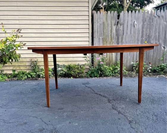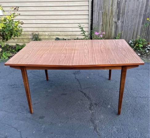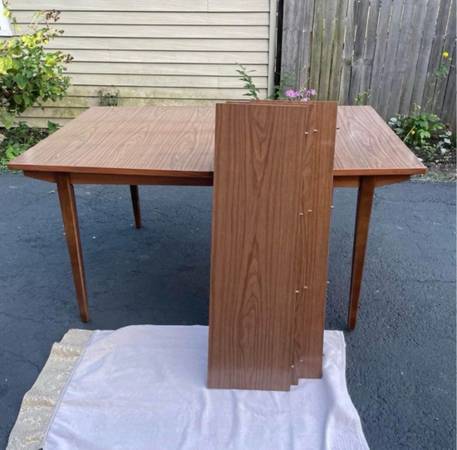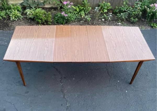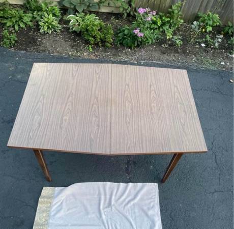 Available Mid Century Modern Formica top Table and 3 Leaves. This piece is in excellent condition please see all pictures and ask any questions you may have about this piece. Delivery is available to all Chicago land and suburbs.message at show contact info
