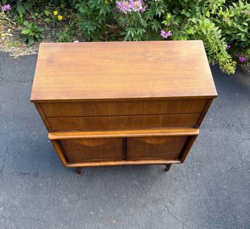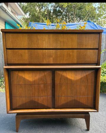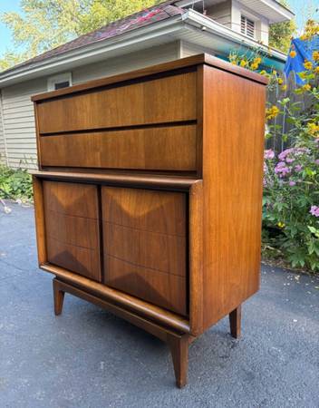 Available Mid-Century Modern United Diamond Walnut High Chest. All drawers work well, they consist of solid wood and dovetailed. This piece shows some blemishes from age please see all pictures and ask any questions you may have about this piece. Delivery is available to all Chicago land and suburbs.