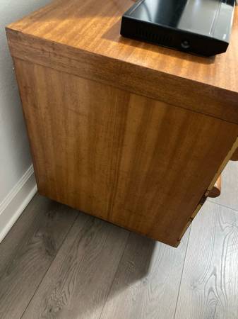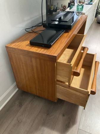 Available we have this unique Mid Century Modern Vanity/ Credenza/ Dresser/ Media center. This piece shows some imperfections from age and from being pre-own please see all pictures and ask any questions you may have about this piece. Delivery is available to all Chicago land and western suburbs.please message at show contact info