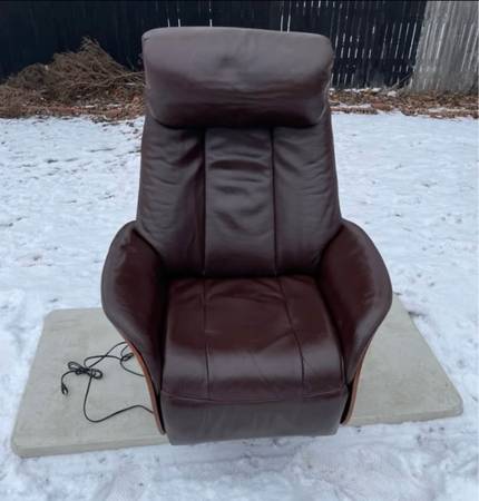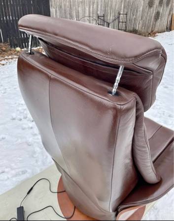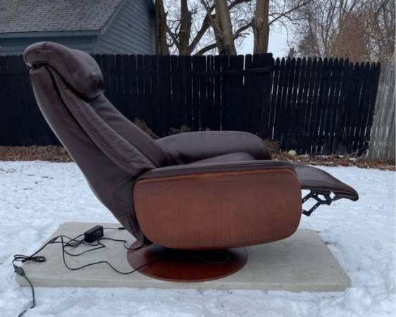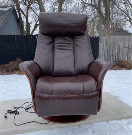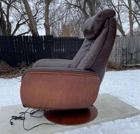 Available Modern Power Recliner. This chair is In perfect working condition, the motor is smooth and the chair is comfortable. The up and down buttons are tactile. Please see all pictures and ask any questions you may have about this piece. It does show a scratch as pictures.