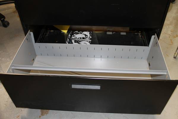 2 drawer black lateral file cabinet, a few marks from use, both drawers slide with no trouble, and mhave metal supports for file folders. Pick up in Brookfield, IL