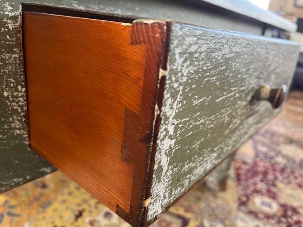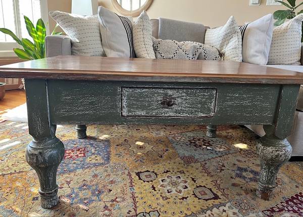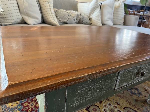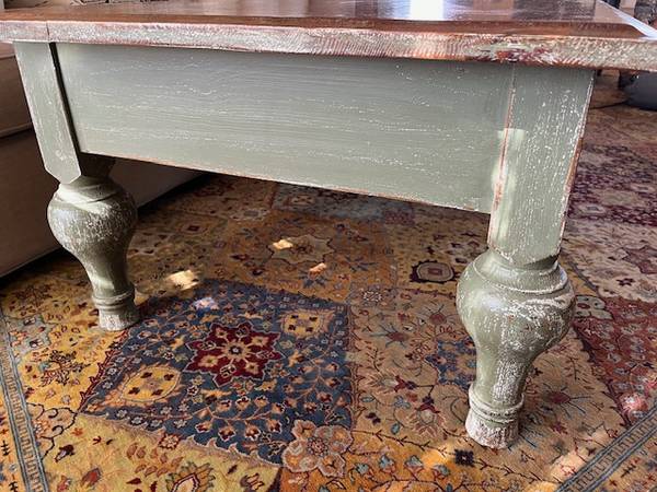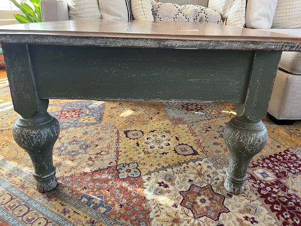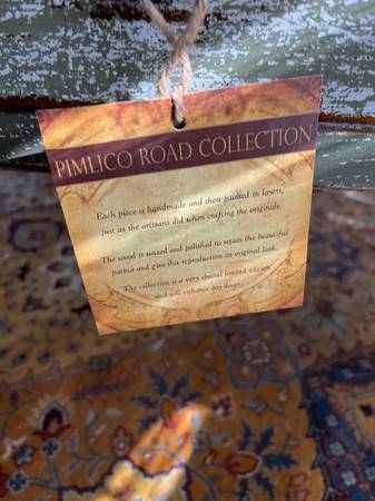 Selling this Pimlico Road Collection, high-end Italian made, factory distressed, green, solid wood coffee table. Beautifully made. Generous size. Purchased through designer. Size did not work for our space.. Measures: 21" T x 32 " D x 46" W. Smoke-free/pet-free home. Cash only