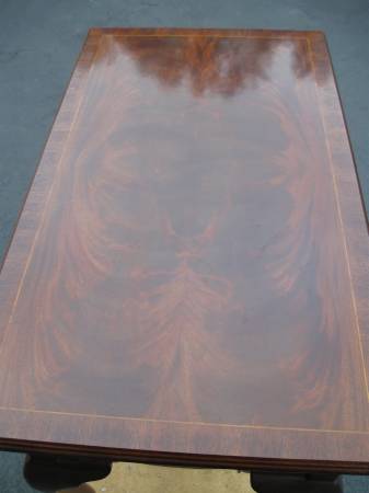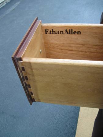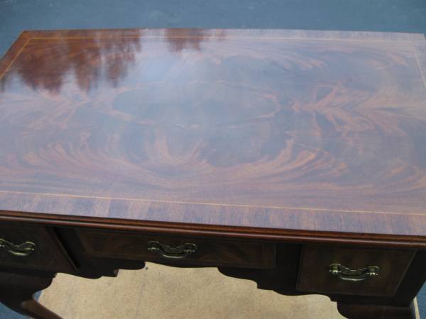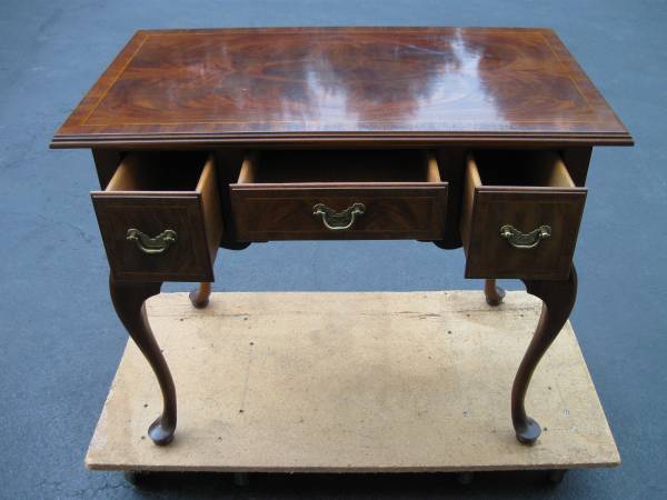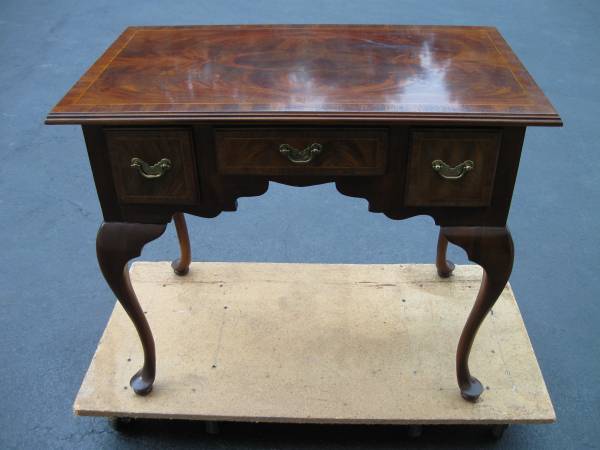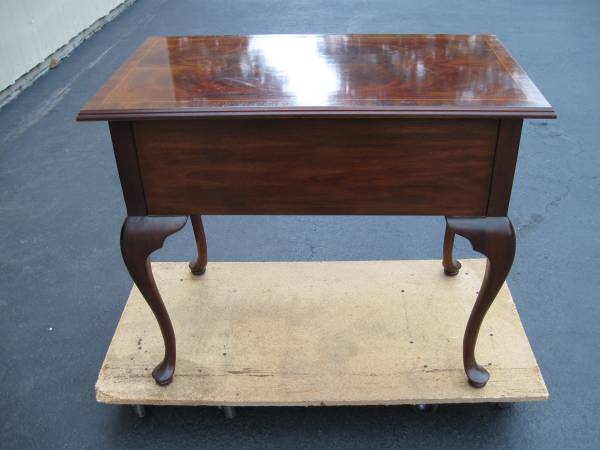 This is a very beautiful vintage Eathan Allan lowboy chest/console/dressing table/desk that is 33" long by 19" wide by 27 tall. It is made of Flame Mahogany with Queen Anne styling and it has a stamped ID number of 320487 along with Eathan Allan. This is a must see item because I don't feel that my pictures due it the justice as when seen in person.It also is in very good condition with a few minor imperfections in the top due to age and wear hence the price of only $650. Cash at time of pick up. NOTE: It is presently setting on a dolly for ease of movement.