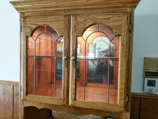 Country style solid oak cabinet with interior lighting and leaded glass doors. No veneers. Satin honey oak finish in excellent condition with no scratches. Separates into two pieces for easy...