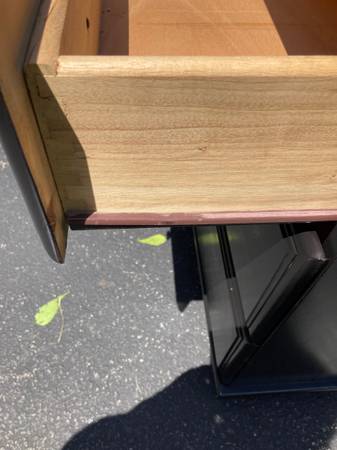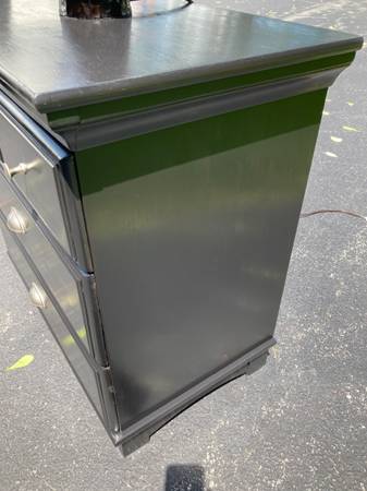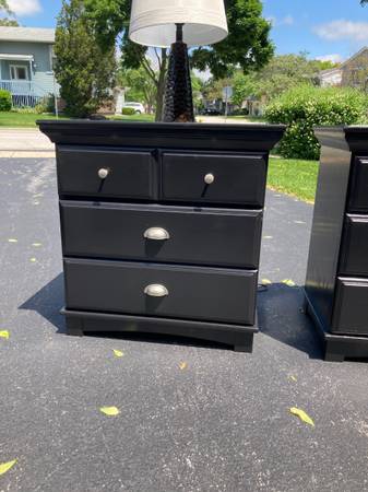 The two sleek dovetailed wood nightstands have been sanded & refinished with 2 coats of Behrs black semi gloss Primer & paint. The Nightstand tops have been given a protective acrylic finish. Excellent condition! Features three spacious drawers each that operate smoothly with silver knobs & pulls.