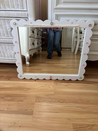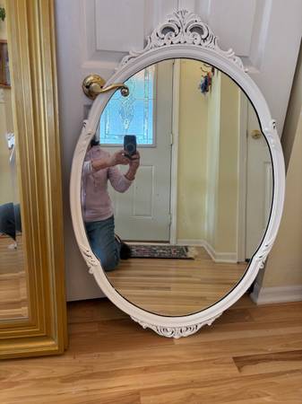 1)Elegant Large carved refinished white mirror: excellent condition….$85