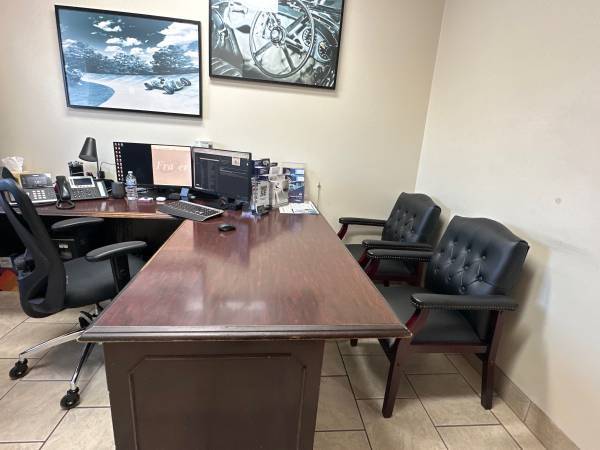 For sale is our wood office desk, includes cabinet $300 Call or text Alex