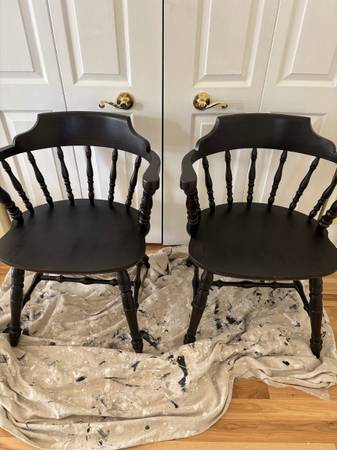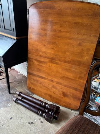 The table was block sanded & then stained in a nice Miniwax red mahogany. After, I put a protective Poly acrylic clear matte finish to the top. The table is in very good condition. And the 2 chairs are in good condition. The chairs look Amish made but have no label. Beautiful wood! Table Dimensions: 40”W x 60.50”L