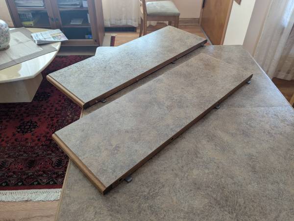 Custom solid wood kitchen / dining room table with patterned table top. Includes 4 cushioned chairs. 1 Table: 48" x 36" x 30" (L x W x H) 2 Leaves: 12" width each - With both leaves, table is 72"...