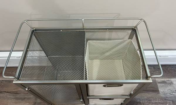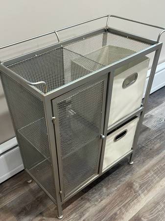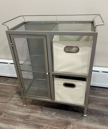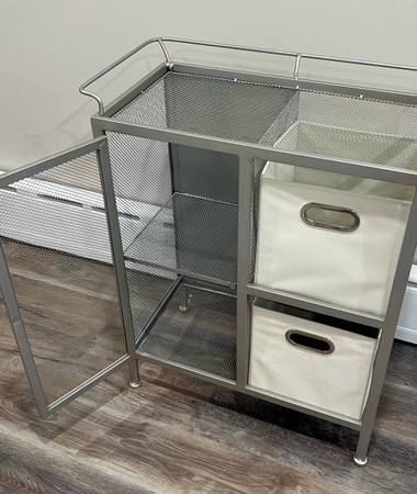 Adorable, unique storage cabinet, screened top, sides and shelves, with 2 fabric bins, one side with screened door. Use anywhere.