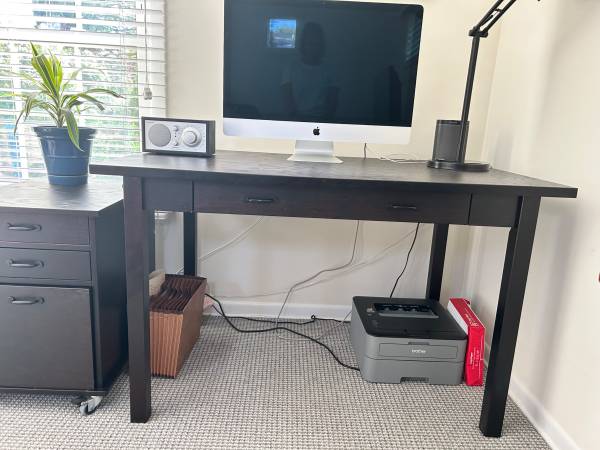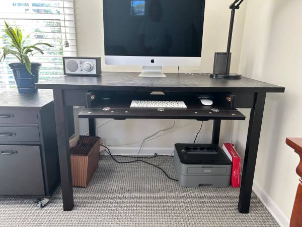 For sale a Crate and Barrel Desk in excellent condition. This desk can make an outstanding addition to your home office or den. It is made of solid hardwood. It comes from a pet free/children free/smoke free home. It includes a pull out top drawer for keyboard. This is a cash only-local pick up.