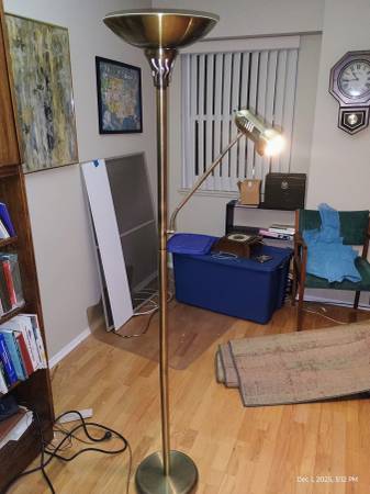 Torchiere lamp with flexible arm bulb in brass finish. 76 high.
