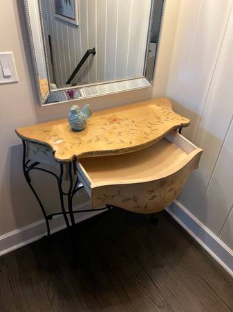 Beautiful like new console table, neutral distressed painted floral on black iron base, use in any room. Functional drawer. 37.5” W x 16” D x 34.5” T Cash and carry