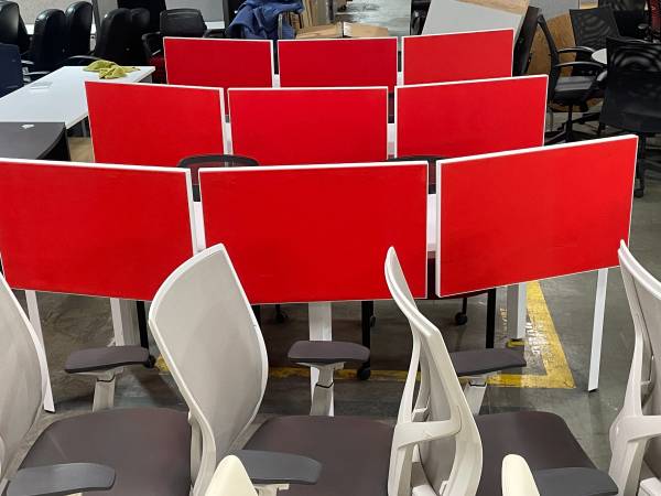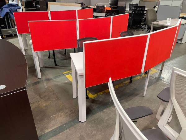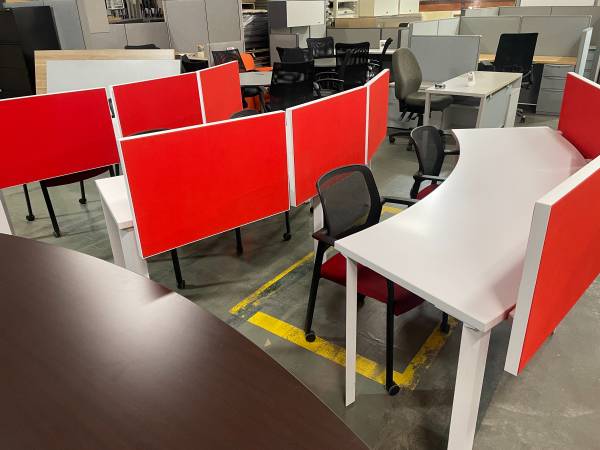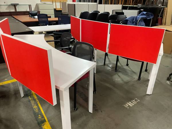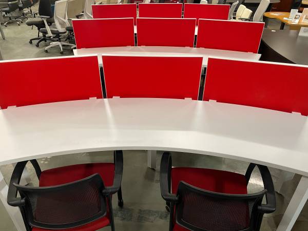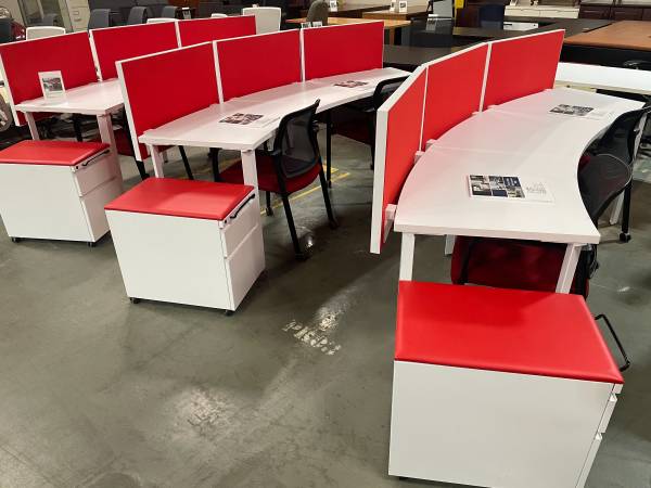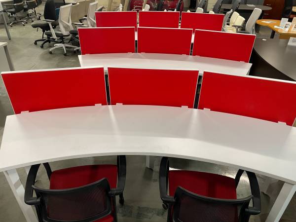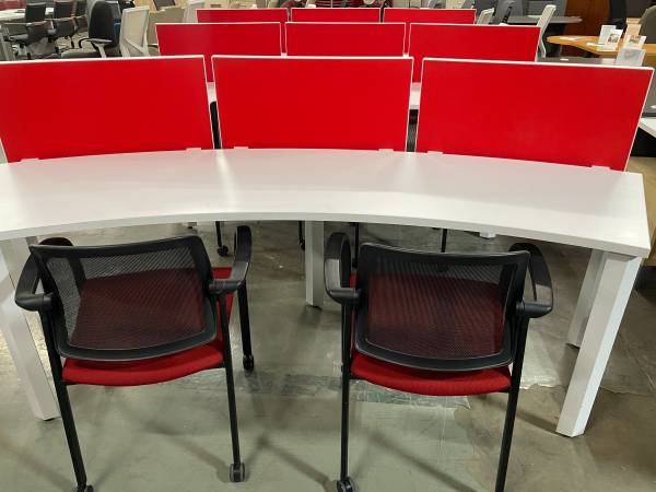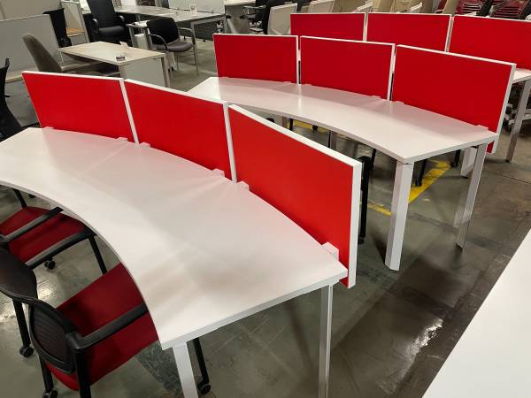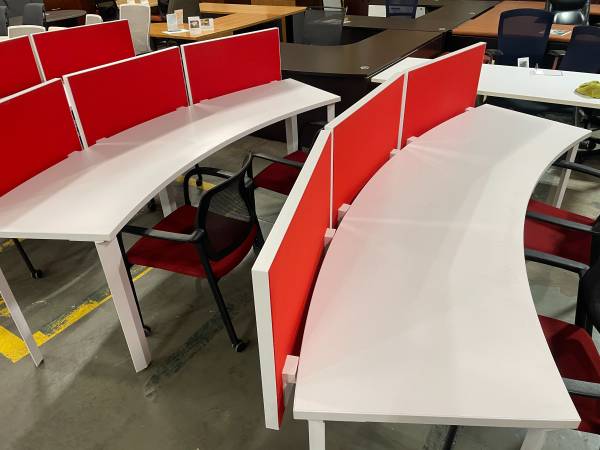 Modern Curved office work station with felt dividers, in excellent condition, comes with (1) Matching mobile pedestal, seats 2 to 3 people per station, save money and impress your employees and clients with this luxurious and modern workstations,