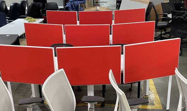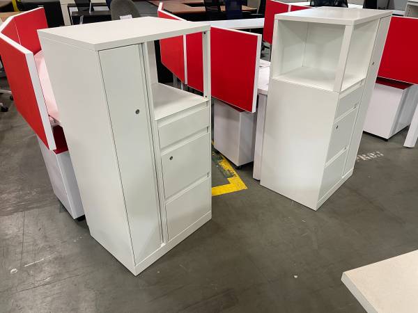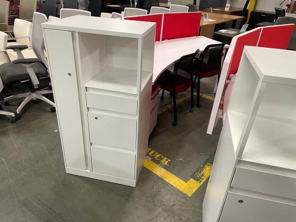 Modern Curved office work station with felt dividers, in excellent condition, comes with (1) Matching mobile pedestal, seats 2 to 3 people per station, save money and impress your employees and clients with this luxurious and modern workstations,