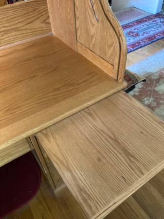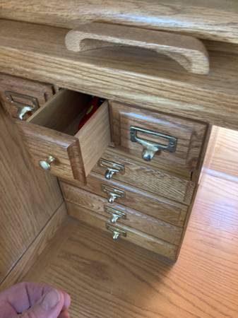 Oak roll top desk and matching chair by Aspen Classics. Overall very good condition with all drawers and roll top working. Many drawers and cubby holes for storing all kinds of items, including locking drawers with keys. Multi-prong electrical outlet and other opening for cables. File cabinet on bottom left side. Two side pull-outs create more working surface. Center pull-out for computer keyboard. Matching oak chair on wheels (with cushion) included. This desk set is solidly built, but the top section can be separated for easier transport. Overall, this desk set can be a functional home-office world station, or a personal storage center. Local pickup only. Desk set is in garage, no stairs. Asking $150 or best offer. Cash only. No scams. If this ad is up then the desk set is available.
