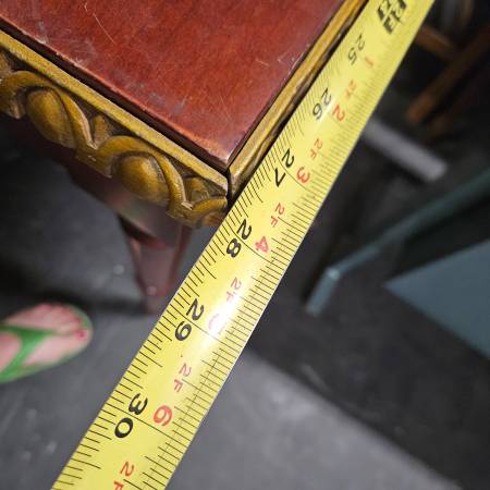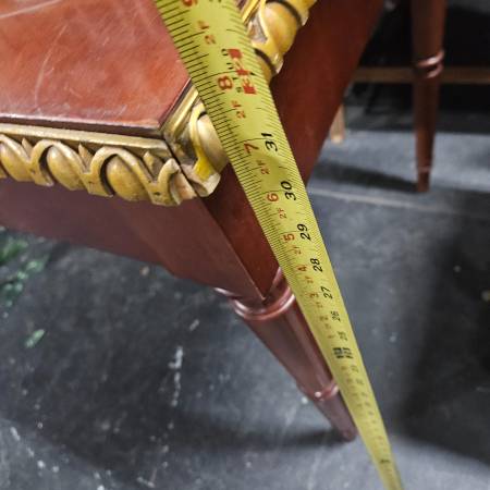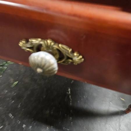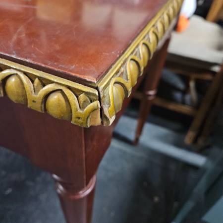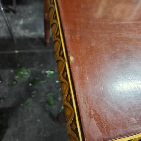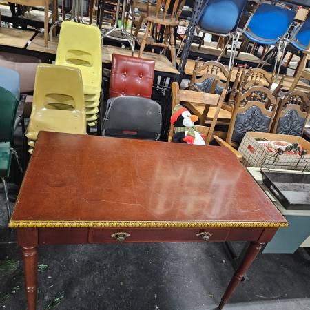 This is a RARE find. This was once in the Hilton Towers, Made by William Montague, which is an exclusive hotel furniture manufacturer. You do NOT see these in the store. Desk appears to be in very nice structural condition but does have some scratches on the top. It appears to be real wood so it can be restored if necessary. It is truly a beautiful piece of furniture even with imperfections. This desk makes a statement! Measures: 47.5"W x 27.5"D x 31.5"H Was $395 Now $295