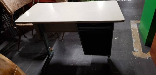 Awesome desk looks like something out of the Jetsons. It seems shorter than a standard so possibly for a child but it does accommodate a normal size chair with room for your legs, It is in great shape. Nice and sturdy. Top doe have some scratches. MEASURES APPROX 34"w X18"d X 27"h. Was $295 Now $195