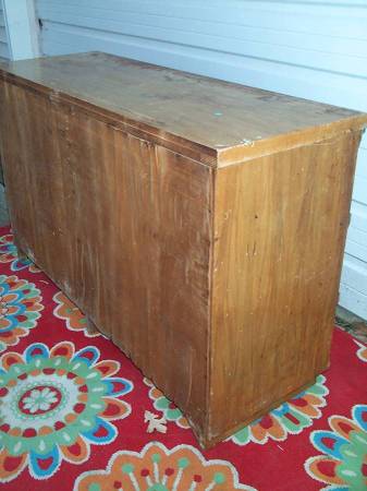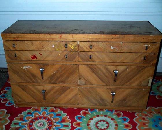 Antique 8 drawer dresser. All the drawer pull handles are in place. Circa 1940's 1950's vintage. Part of one of the front drawer's laminate has corner damage. No water damage. I found gift wrapping paper circa 1940's in the dresser and will leave that as a bonus for the next owner. With some wood restoration this dresser will be a gorgeous piece of furniture. Looks like burled oak type wood. Pick up from North Aurora. Please call or text show contact info